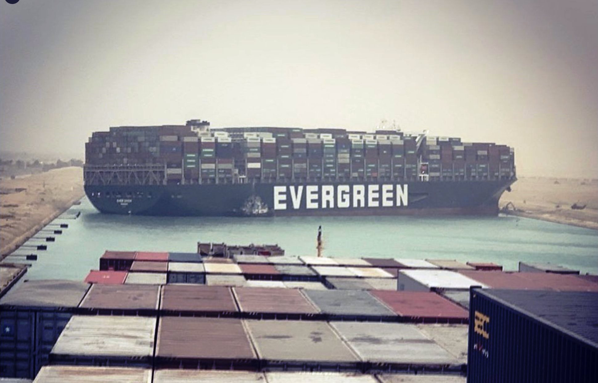 #Suez Canal traffic jam — Evergreen Marine's "Ever Given" stuck in the canal above Port Said. 400m ship seems fully laden. @Samir_Madani @TankerTrackers reporting 10m barrels of Saudi, Russian, US and Omani crude parked. #OOTT Oil up $1+ after recent selloff pic.twitter.com/fLHxITGOE5