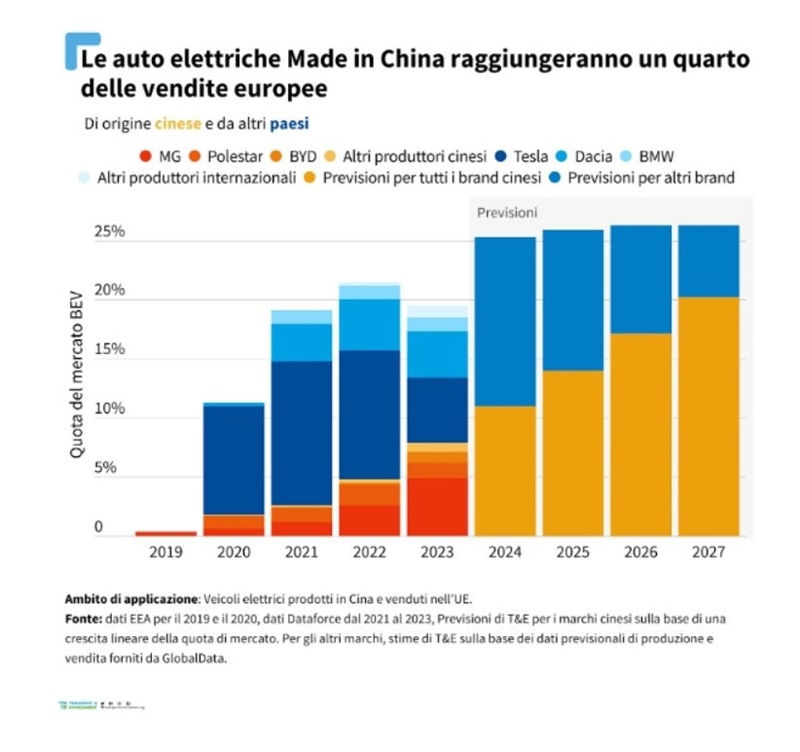 Nel dettaglio, una analisi di Transport & Environment (T&E) ha evidenziato che quasi un quinto (19,5%) dei veicoli elettrici venduti in Europa l’anno scorso è stato prodotto in Cina – una quota che in Italia raggiunge già il 23% – e che questa salirà a un quarto (25%) nel 2024.
