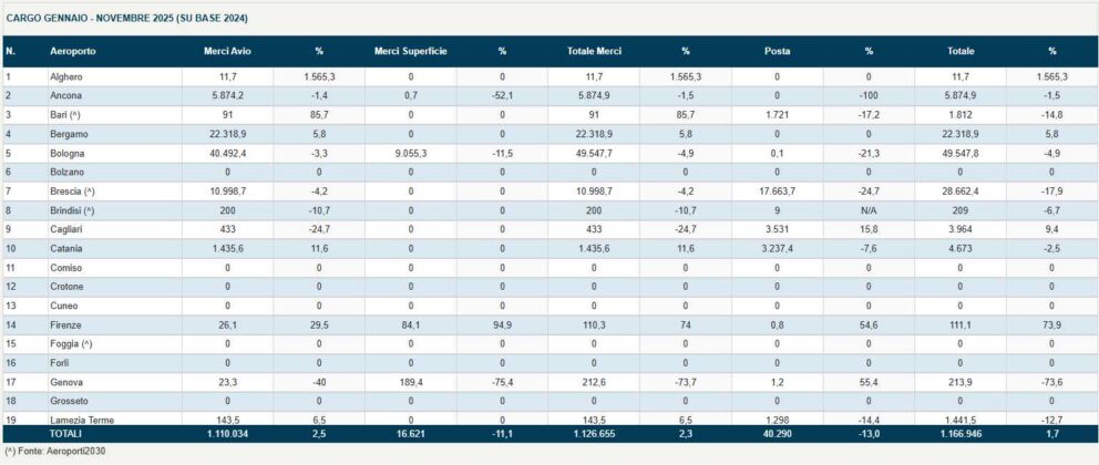 Il mese di novembre 2025 si chiude infatti con un segnale decisamente positivo per il comparto cargo. Secondo i dati mensili aggregati dell’Associazione Italiana Gestione Aeroporti, il volume delle merci trasportate ha raggiunto quota 111 mila tonnellate, registrando un incremento del 7,3% rispetto allo stesso mese del 2024. Un risultato che consolida una tendenza al rialzo e che si riflette anche nei dati progressivi: da inizio anno (periodo gennaio-novembre 2025), il totale delle merci movimentate è pari a 1.166.000 tonnellate, corrispondente a una crescita complessiva dell’1,7% rispetto ai primi undici mesi dell’anno precedente.