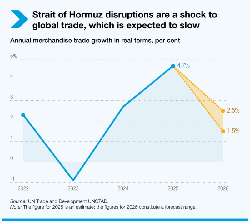 Mentre la via d’acqua resta “praticamente chiusa”, la prima previsione drammatica a saltare all’occhio è quella relativa al rallentamento degli scambi globali di merci, che in conseguenza della crisi vivranno nel 2026, secondo l’agenzia Onu per il commercio e lo sviluppo, un incremento contenuto, nell’ordine del +2,5% nell’ipotesi migliore e dell’1,5% in quella peggiore, a fronte della crescita del 4,7% registrato nel 2025.