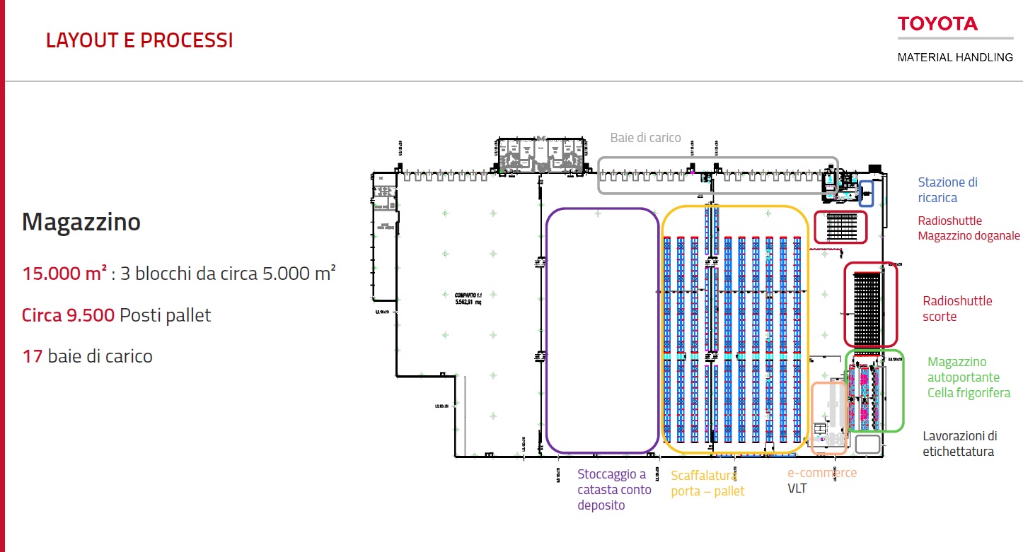 Nel rinnovato centro logistico hanno trovato spazio anche 10 postazioni di ricarica i_battery per il funzionamento dei 19 carrelli. In termini di attrezzature sono state fornite e installate una scaffalatura porta –pallet, radio shuttle, un magazzino autoportante refrigerato e un magazzino verticale.