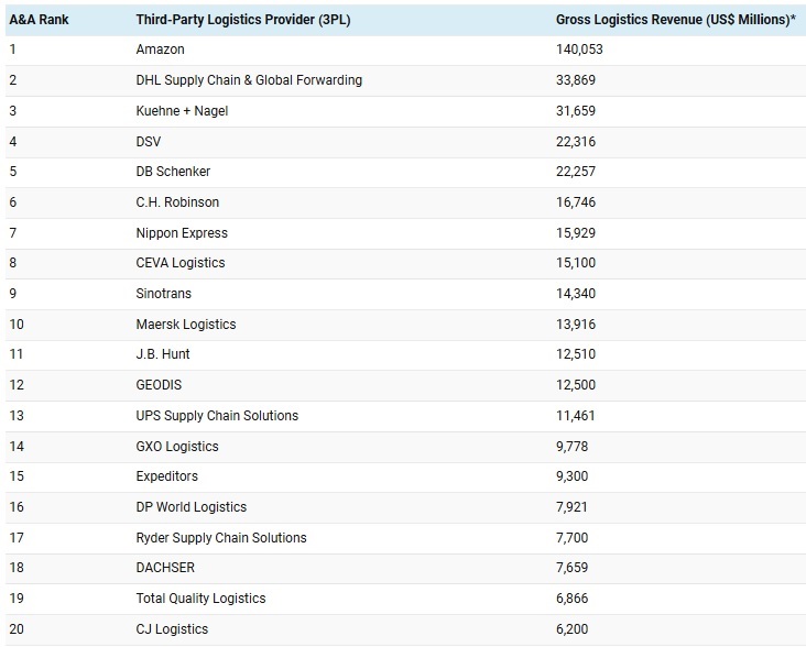Amazon, Dhl (con le divisioni Supply Chain & Global Forwarding) e Kuehne + Nagel sono sul podio della classifica dei 50 principali operatori globali di servizi 3pl stilata Armstrong & Associates Inc. La lista pubblicata dalla società di analisi statunitense prende come parametro i ricavi lordi generati per ognuno di essi dall’attività logistica nel 2023, sulla base di informazioni comunicate ufficialmente dalle società in questione o stimati dalla stessa A&A.